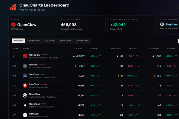 ClawCharts tracks the explosive Claw ecosystem in real time, ranking nine projects by stars, commits, and contributor momentum.