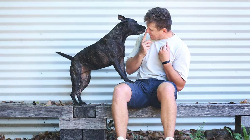 Rosie is a Staffordshire Bull Terrier and Shar Pei cross. Conyngham adopted her from a Sydney shelter in 2019, after she had been abandoned in bushland. He describes her as his closest companion through some of the hardest stretches of his life.