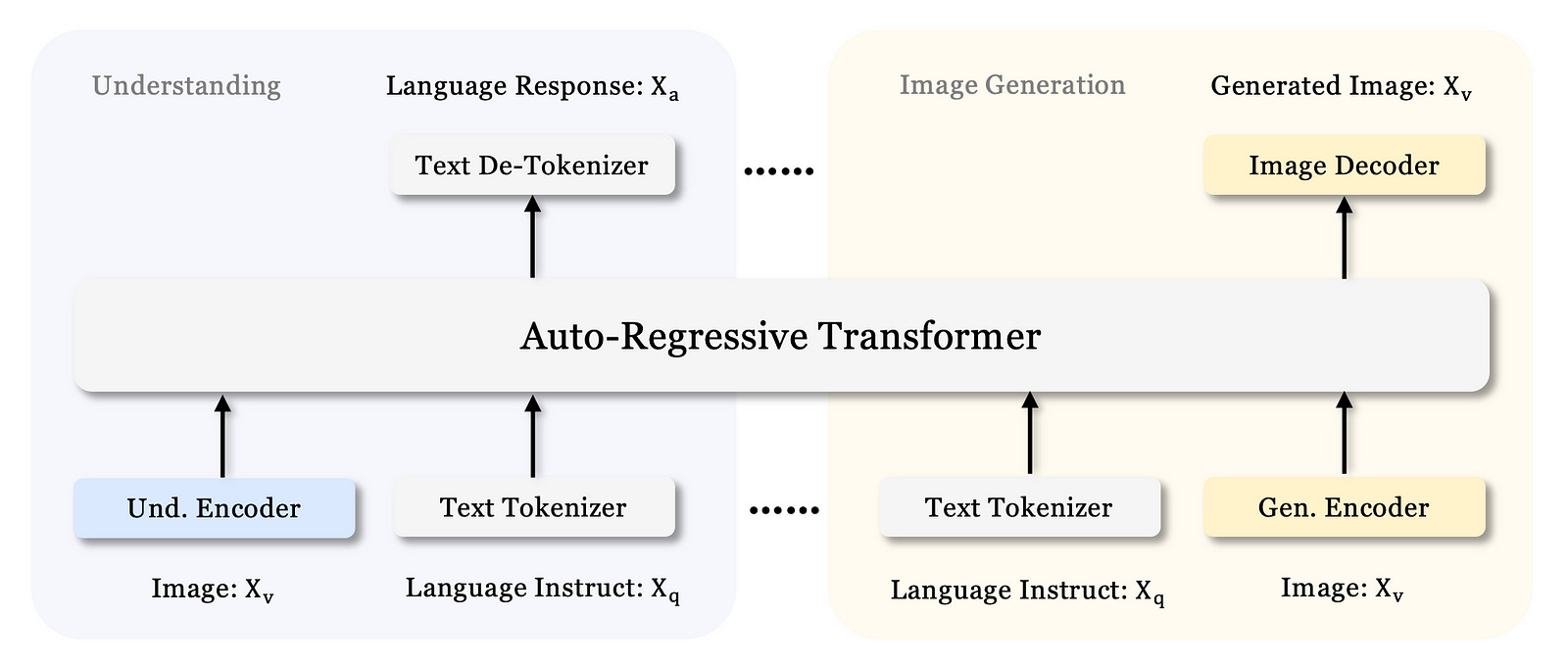 For visual generation, the model uses a VQ tokenizer to convert images into discrete IDs, which are then mapped to the LLM’s input space via a generation adaptor.