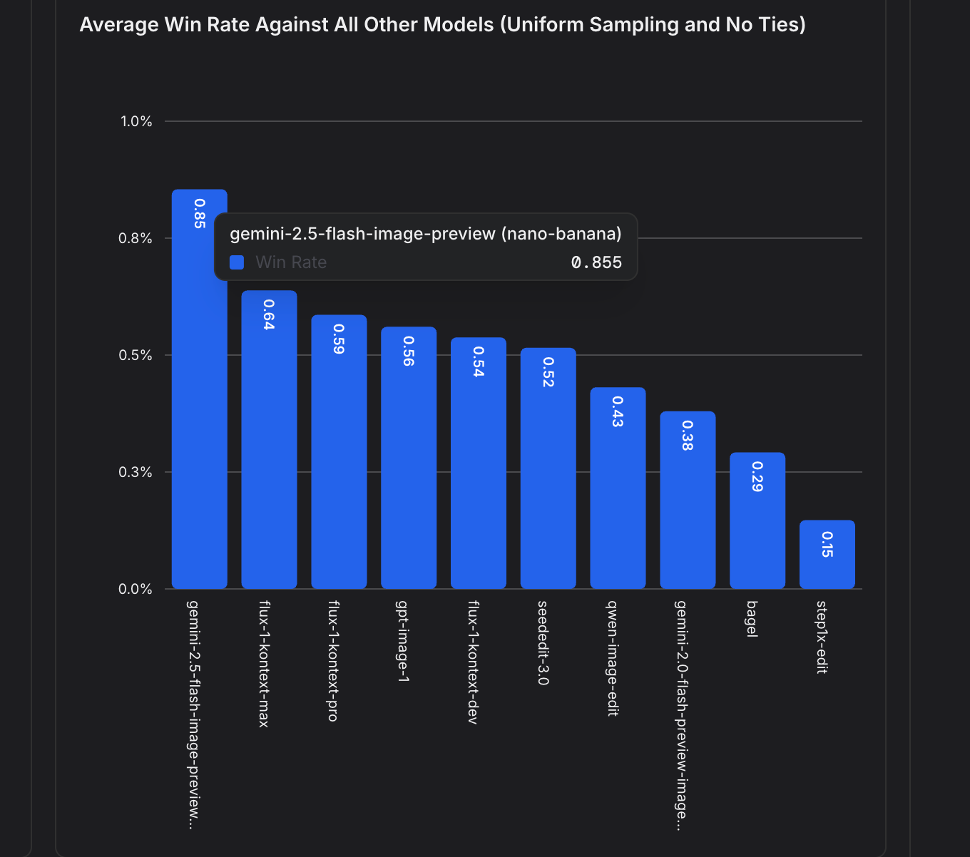 Looking at the average win rate against all other top image models, nano-banana has the highest score of 0.855.