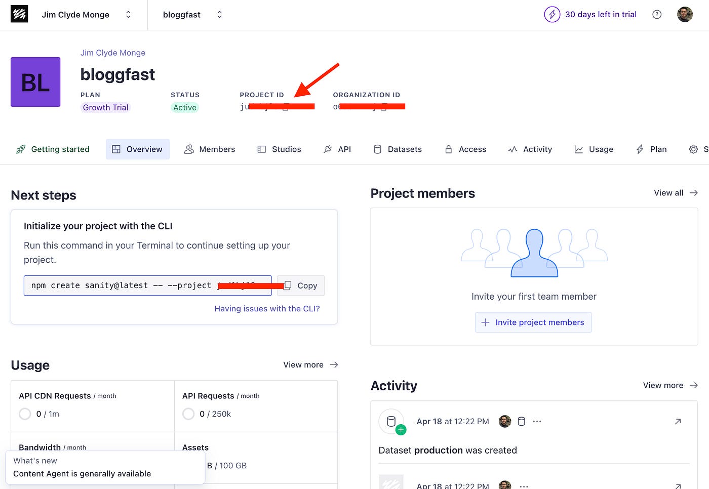 In the project overview screen, you can see the Project ID. Copy this and replace the NEXT_PUBLIC_SANITY_PROJECT_ID in the env file.
