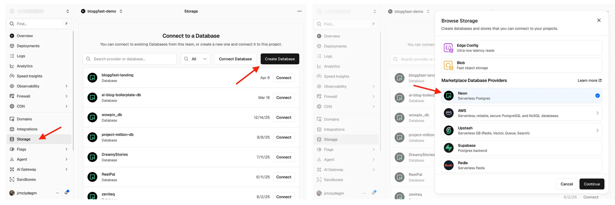 To configure the database, open your Vercel project dashboard and go to the Storage tab. Click Create Database. For this project, use Neon as the database provider.
