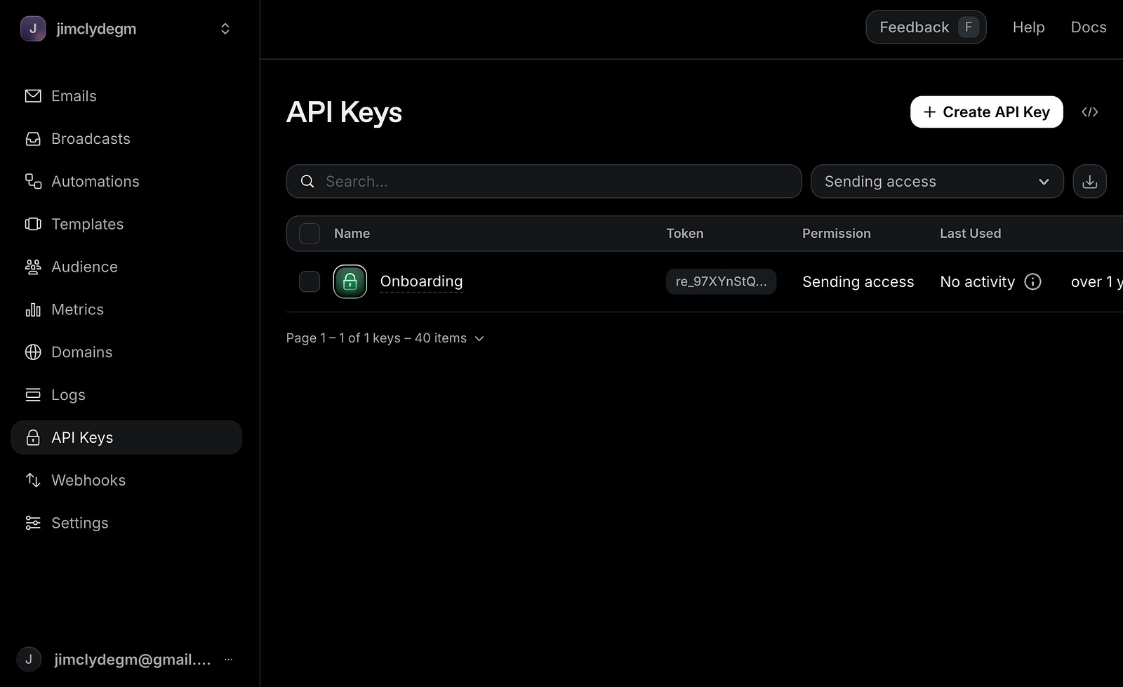 For email delivery, create a Resend account if you do not already have one. In the Resend dashboard, go to API Keys and create a new key.