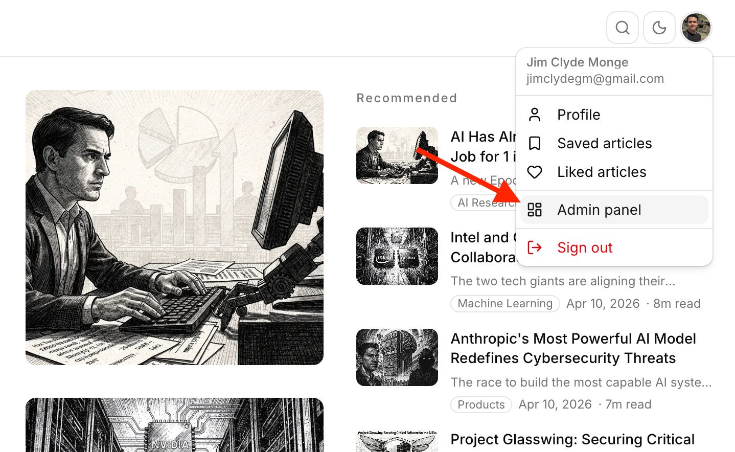 Notice that there is a new “Admin panel” option in the profile menu. This option is only available to administrators.