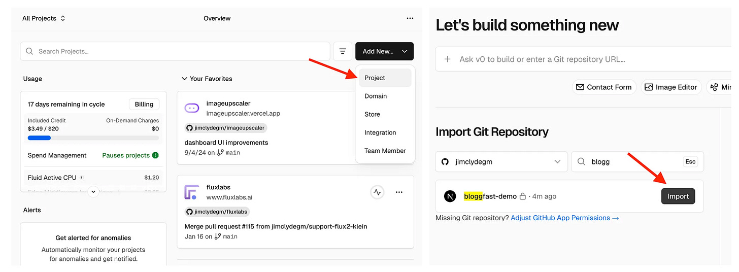 Once the upload is complete, go to Vercel, create a new project, and import the repository. Depending on your account settings, you may need to grant Vercel access to the repository. Follow the prompts shown in the Vercel dashboard.