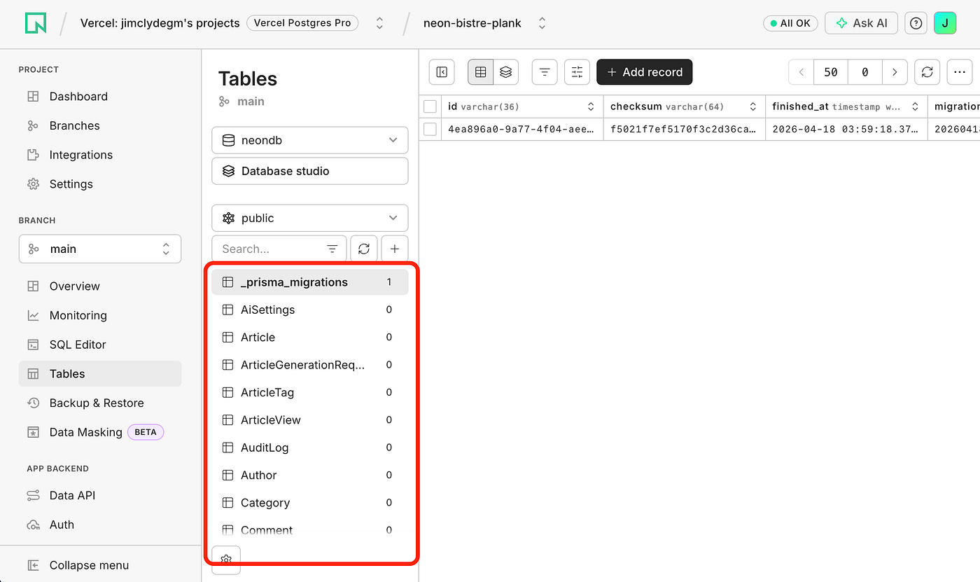npx prisma migrate deployGo back to the Neon project’s page and refresh the Tables dashboard. You should now see all the tables.