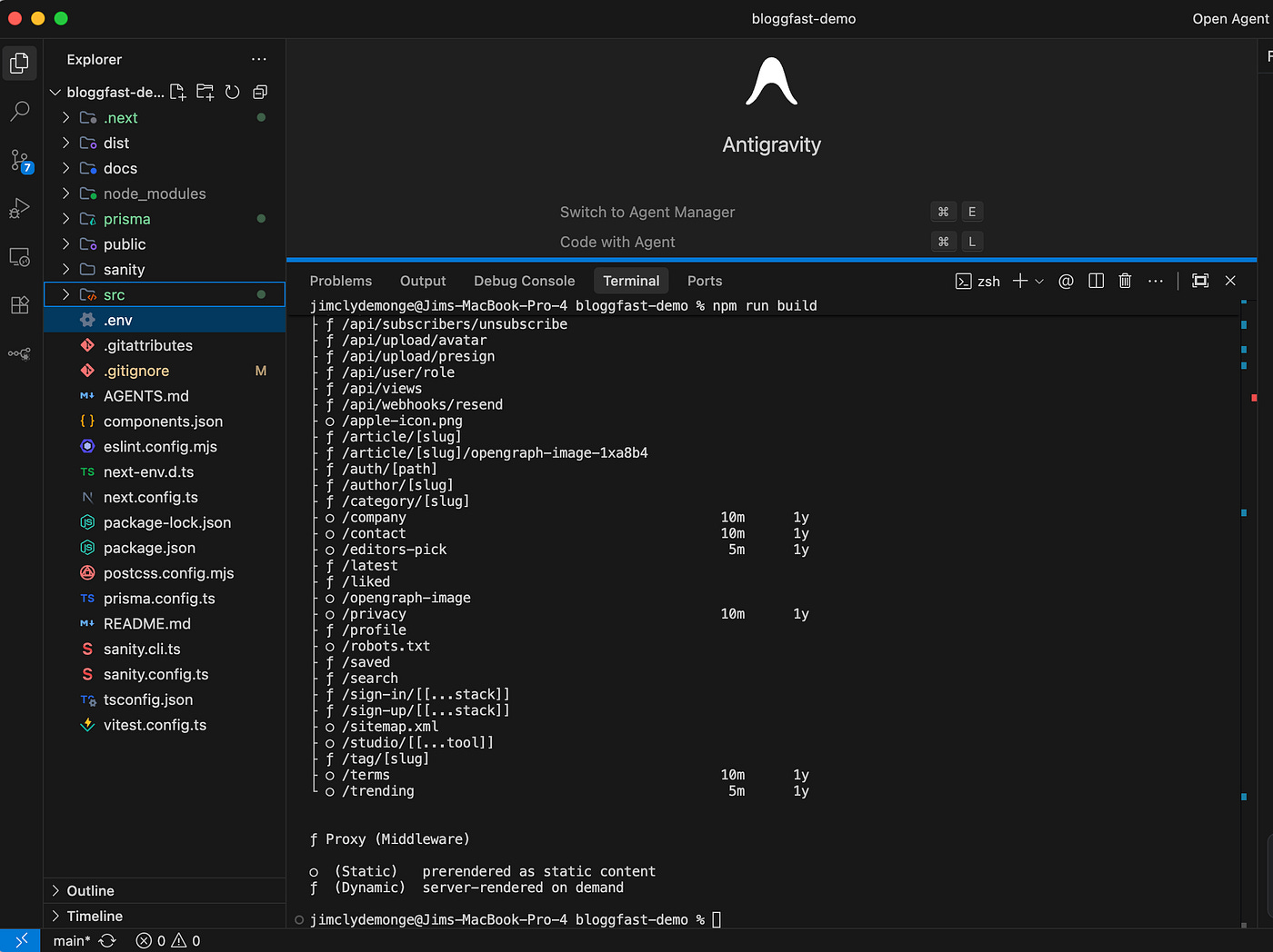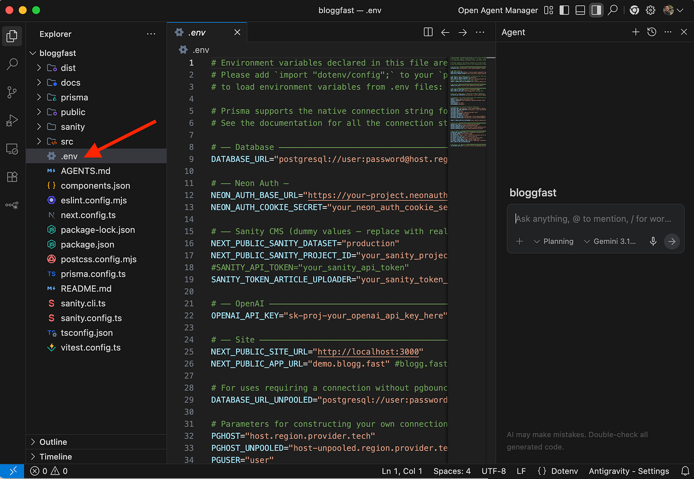 Open the project folder in your preferred IDE. In this example, I will be using Google Antigravity IDE, but any modern editor, such as VS Code, Cursor, or Antigravity, will work just fine.