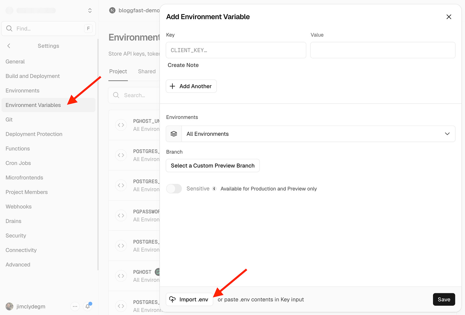 Once your local .env file is complete, open the Vercel project dashboard and go to Settings → Environment Variables. Import or manually add the same variables there so that your Preview and Production deployments use the exact same configuration.