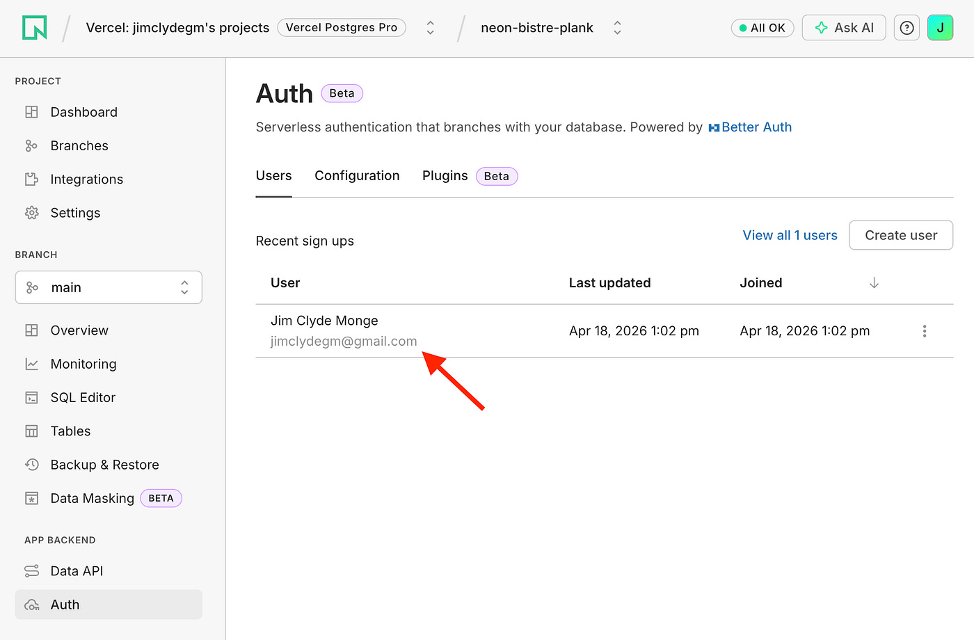 Once login succeeds, check your database and Neon Auth dashboard to verify that the user record and related authentication data have been updated as expected.