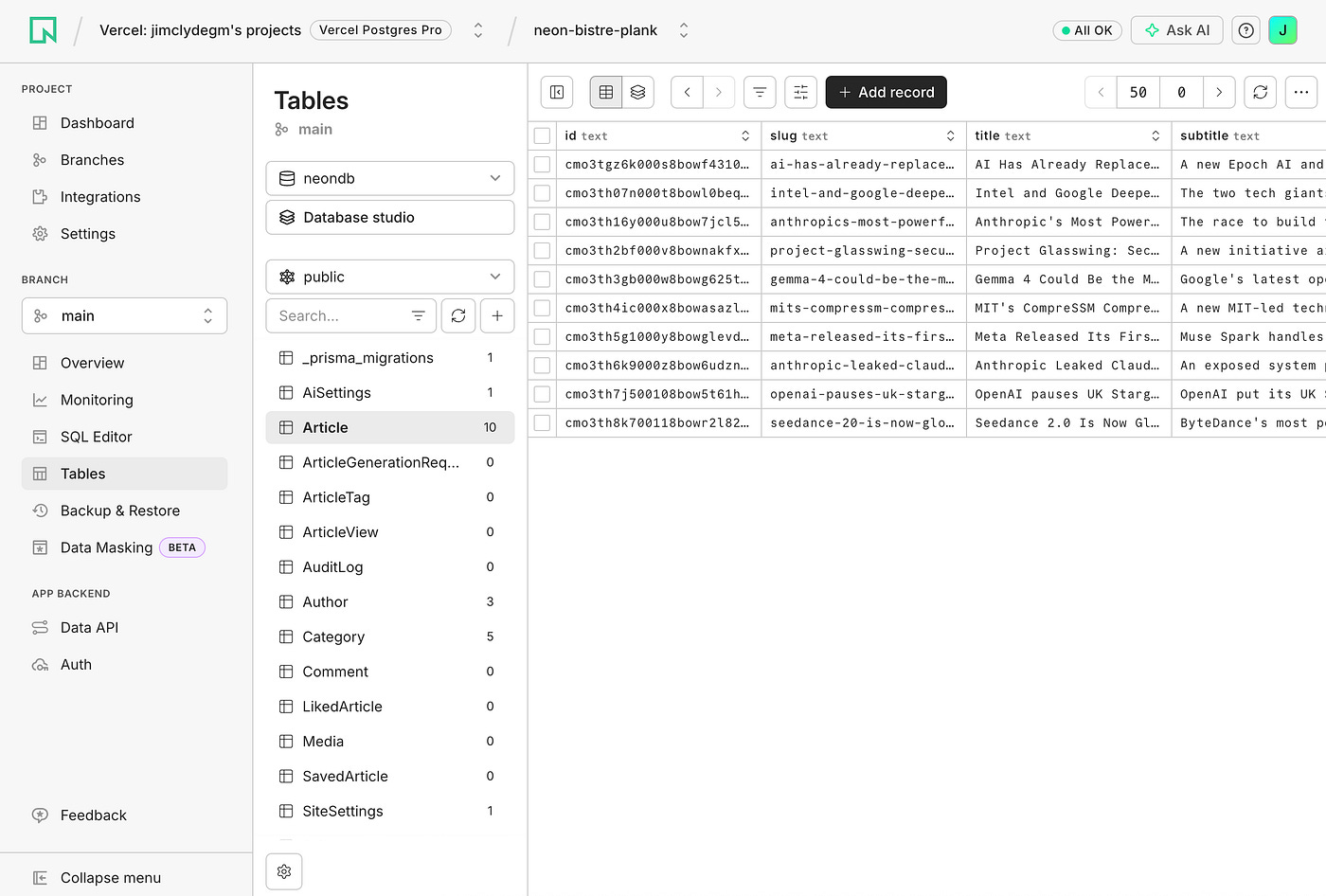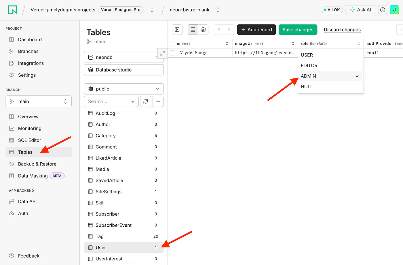 Next, test the AI article generation flow. To do this, we need to see an admin user. In the Neon User table, change the user role to Admin.