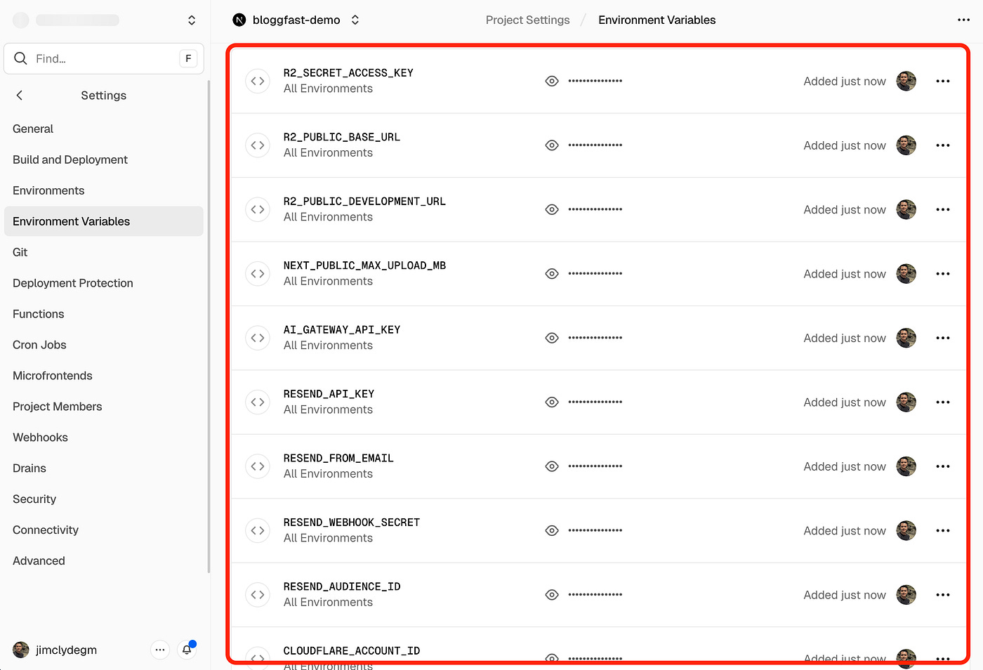 Set R2_BUCKET_NAME to the exact name of the bucket you created. In this example, I have set it to “bloggfast-storage.”