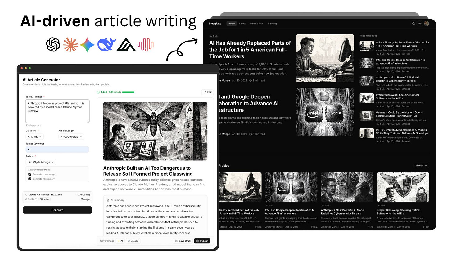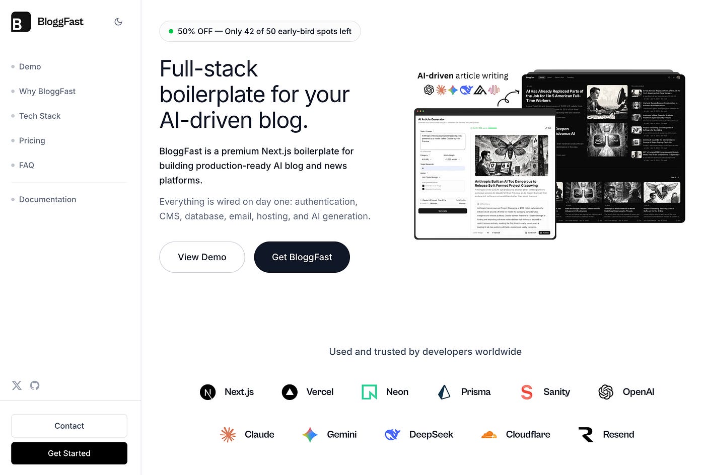 BloggFast is a premium Next.js boilerplate for launching AI-driven blog and news platforms without starting from scratch.
