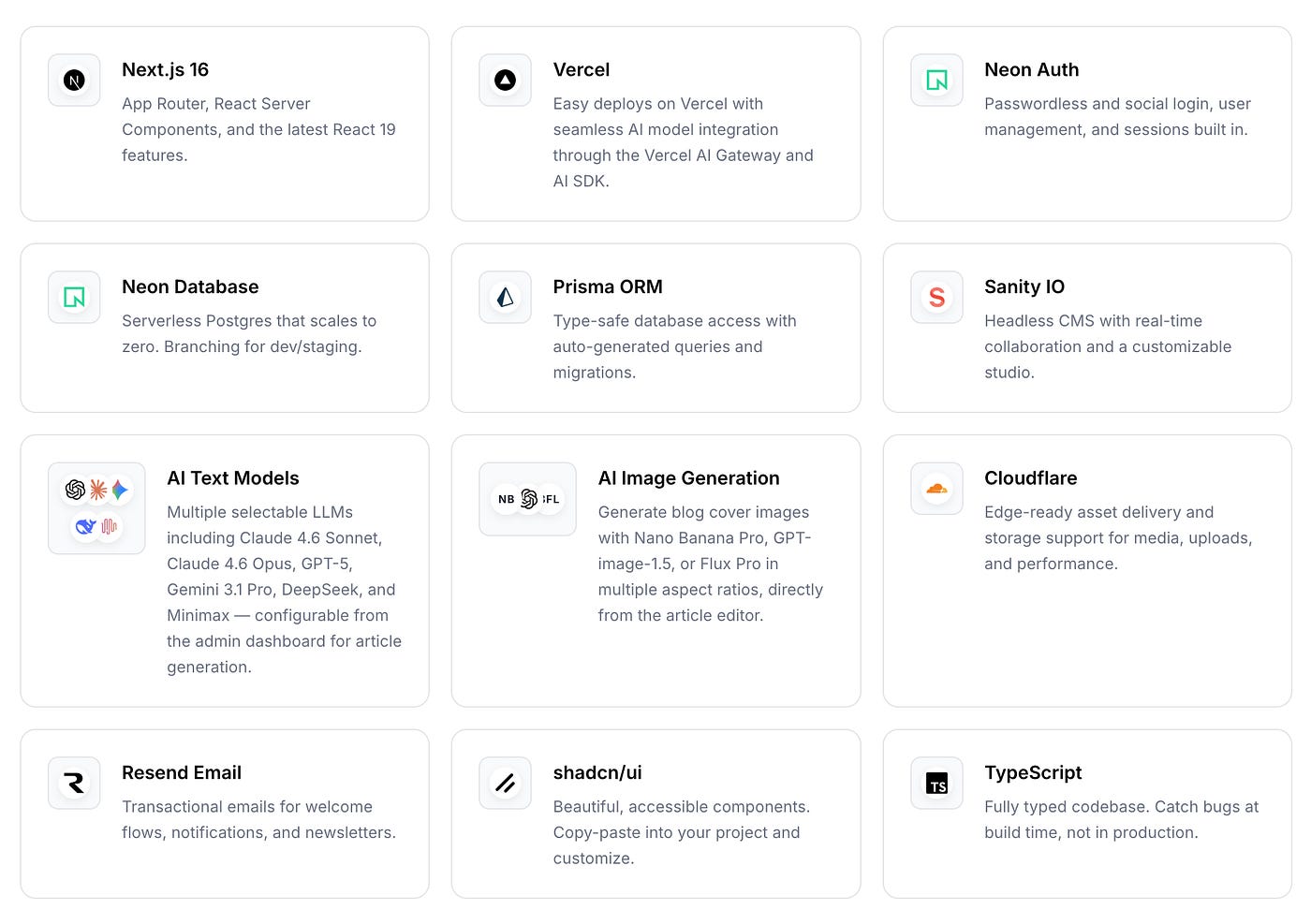 What do I get exactly? You get the complete source code for a production-ready AI-powered blog built with Next.js 16. This includes authentication, database setup, CMS integration, AI article generation, email system, and beautiful UI components.