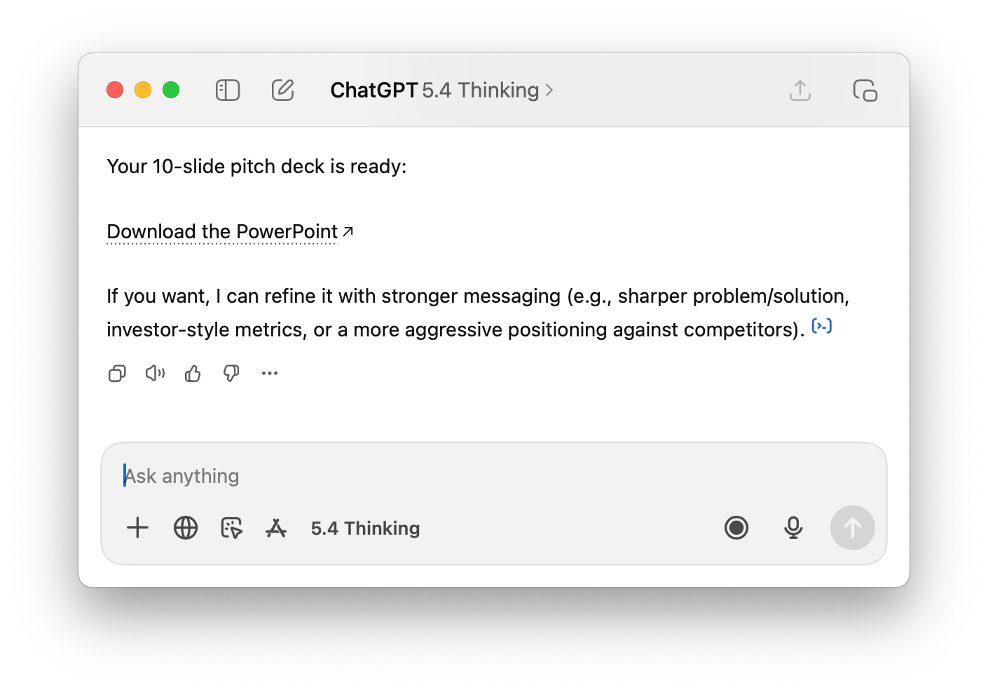 That is really the biggest difference for me. ChatGPT is very helpful for thinking and writing, but not always the most efficient tool for turning that output into a ready-to-use slide deck.