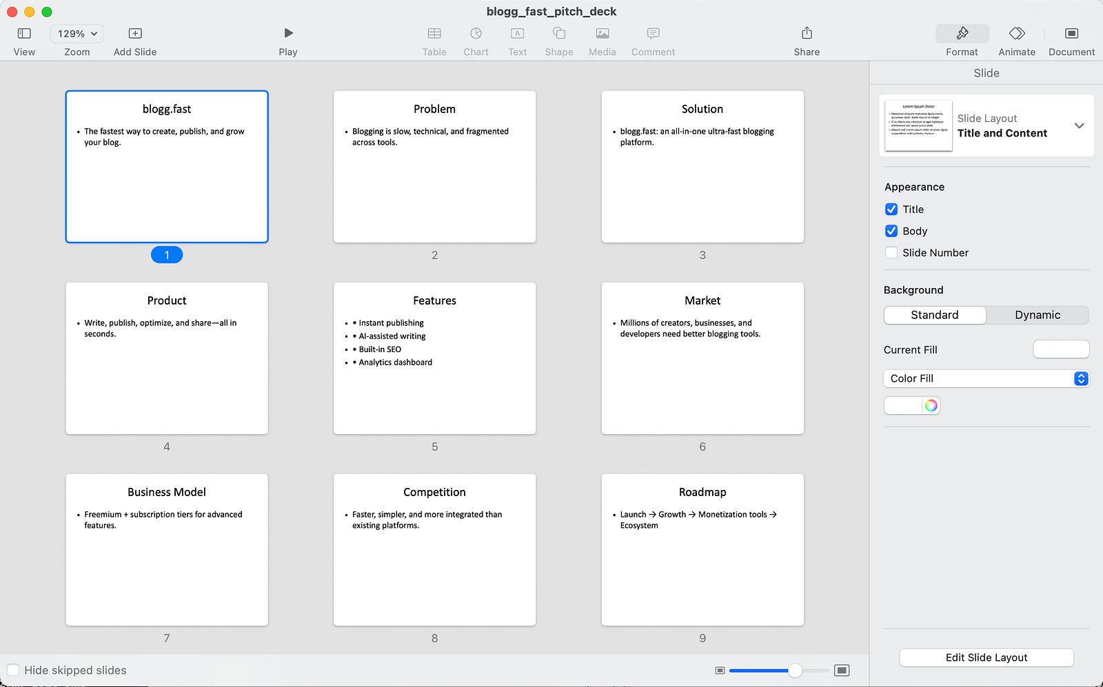 Prompt: Create a 10-slide powerpoint that serves as a pitch deck for my new product blogg.fast
