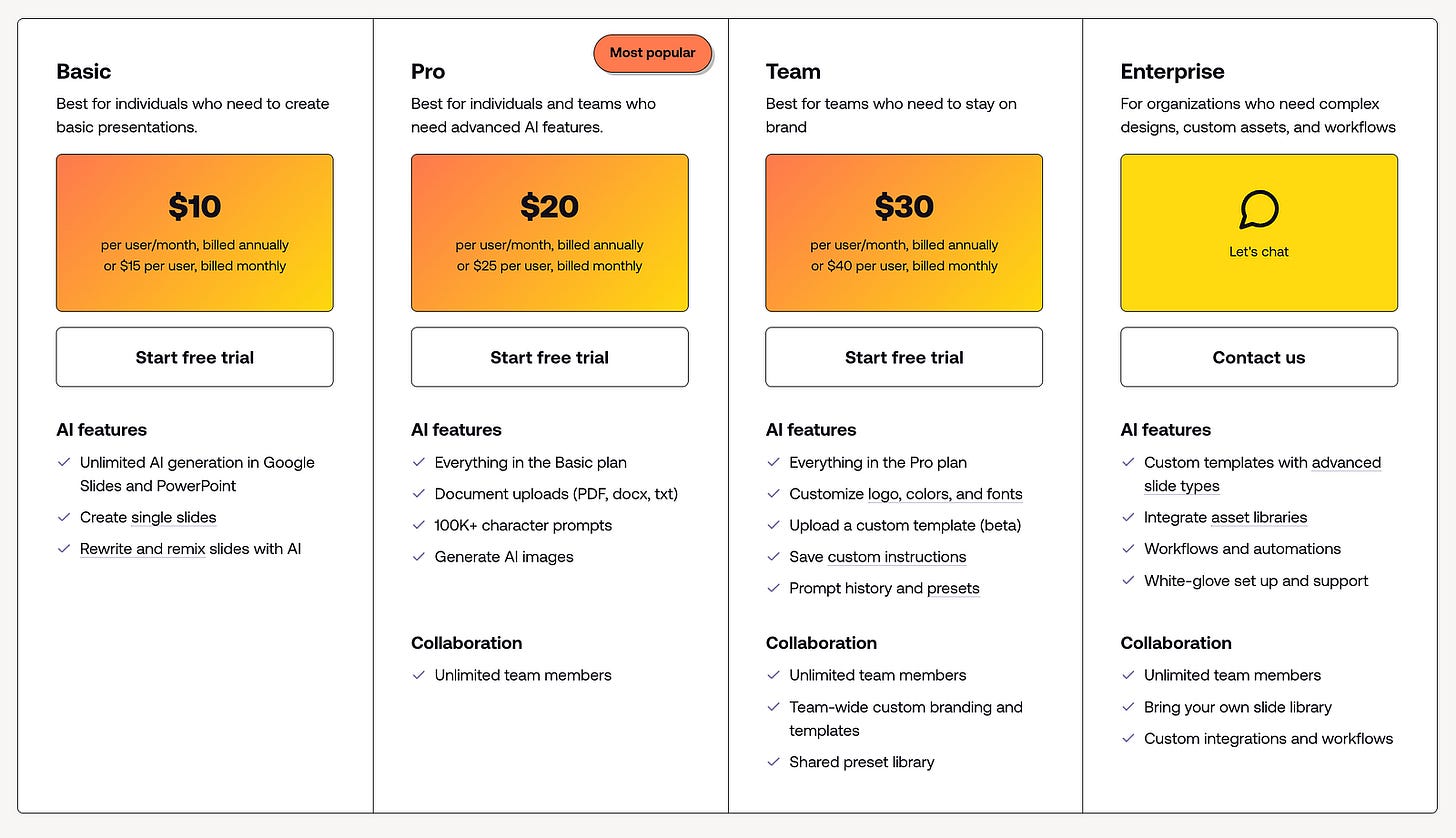 In terms of pricing, the Basic Plan starts at $10 a month and covers unlimited AI generation. The Pro Plan at $20 a month adds document uploads and an AI image generator. You can also opt for the Team Plan, which is $30 per user and includes custom brand themes. There is also an Enterprise option for larger companies.