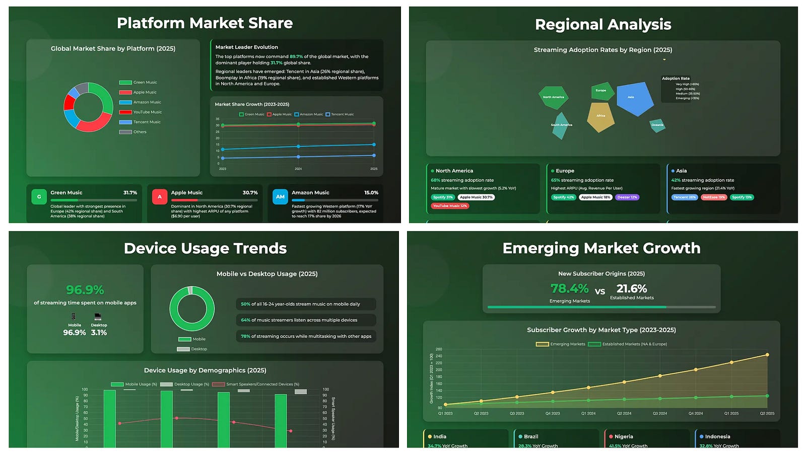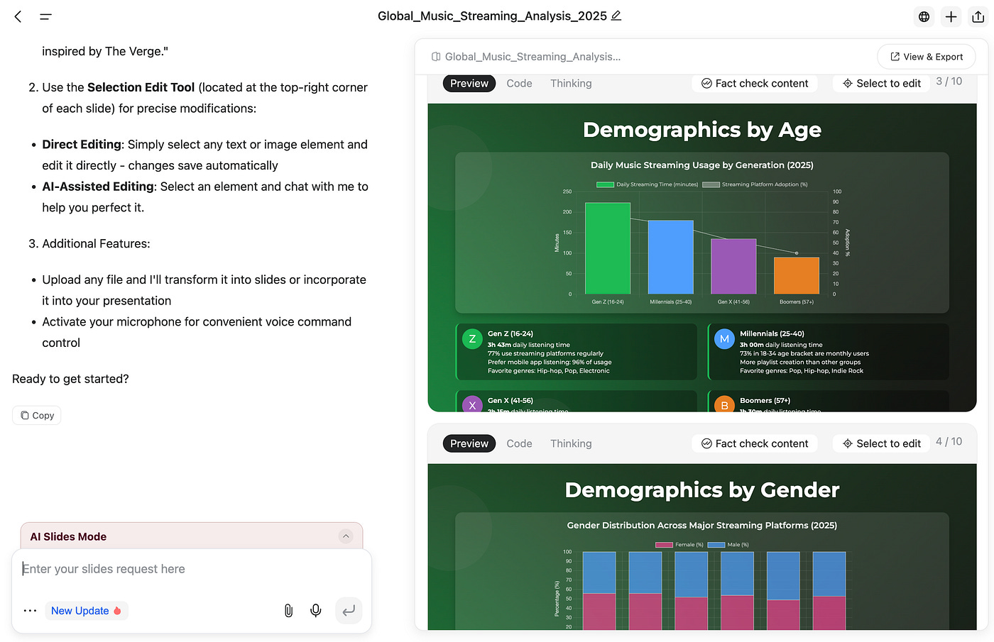 Genspark is fascinating because you can watch it think. When you give it a prompt — for example, asking it to analyze global music streaming behavior in 2025 — it opens a “Thinking” tab. You can actually see the AI breaking down your request, planning the slide structure, and deciding what data points to include. It feels like watching a research assistant work in real time.