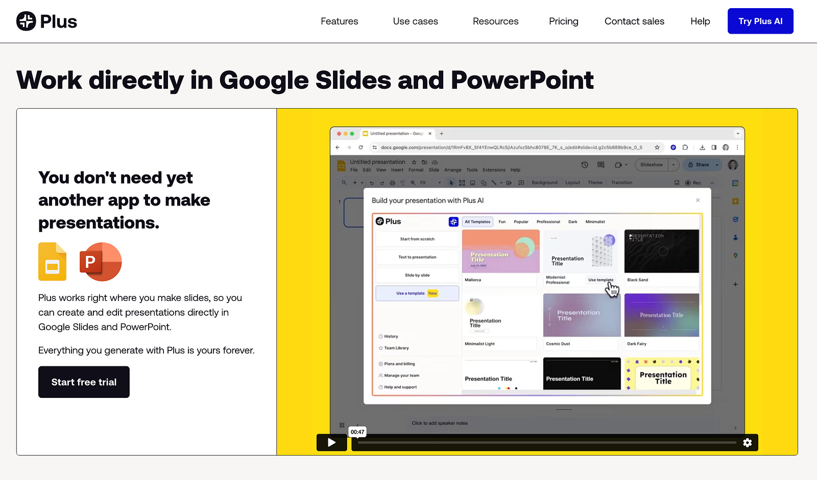 But at the end of the day, productivity is about removing barriers. Plus AI fits into your existing work life without forcing you to learn a new tool or change your habits. It takes the powerful features of PowerPoint and Google Slides and supercharges them with AI.