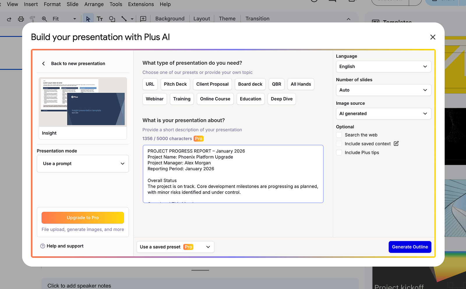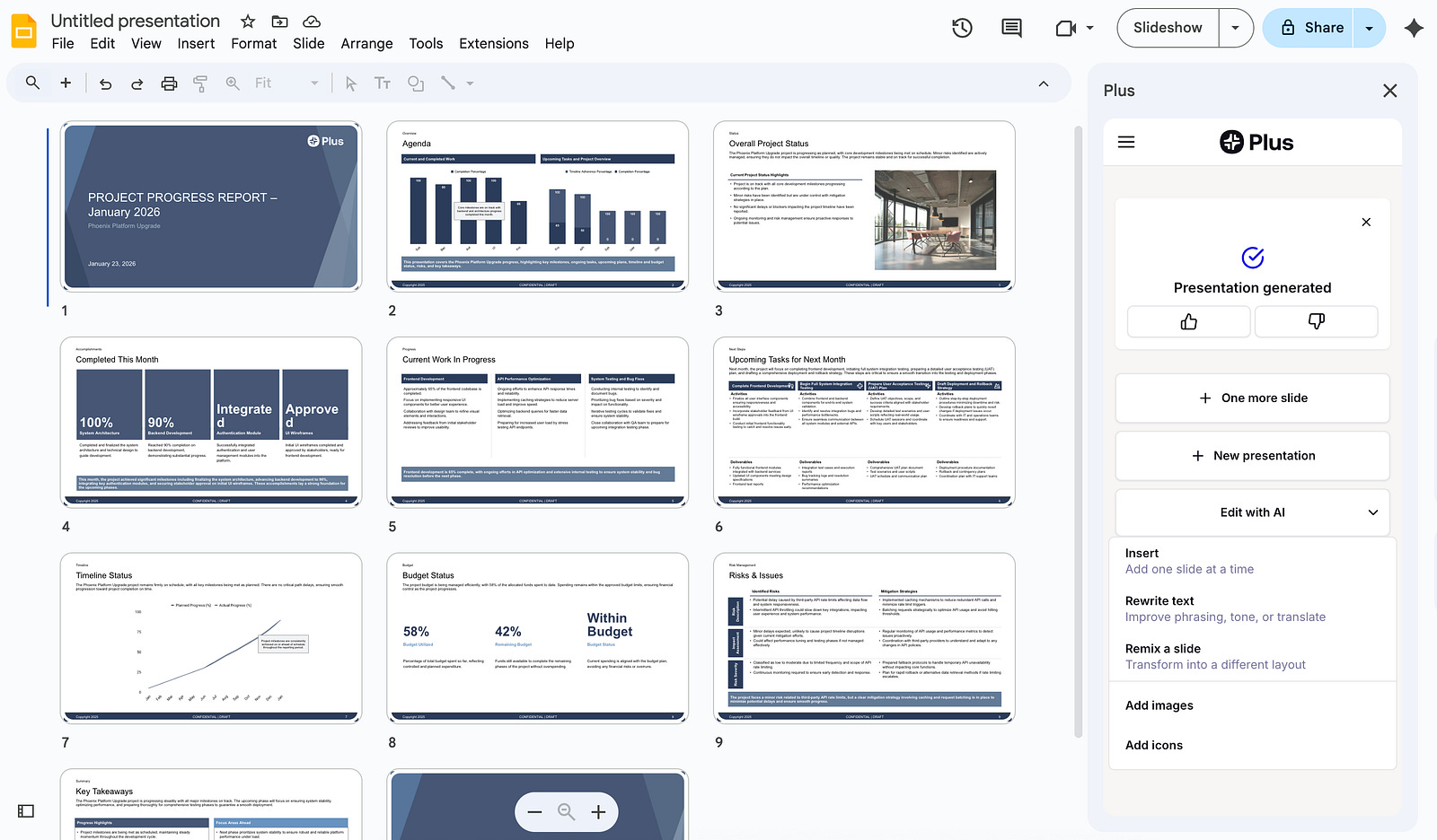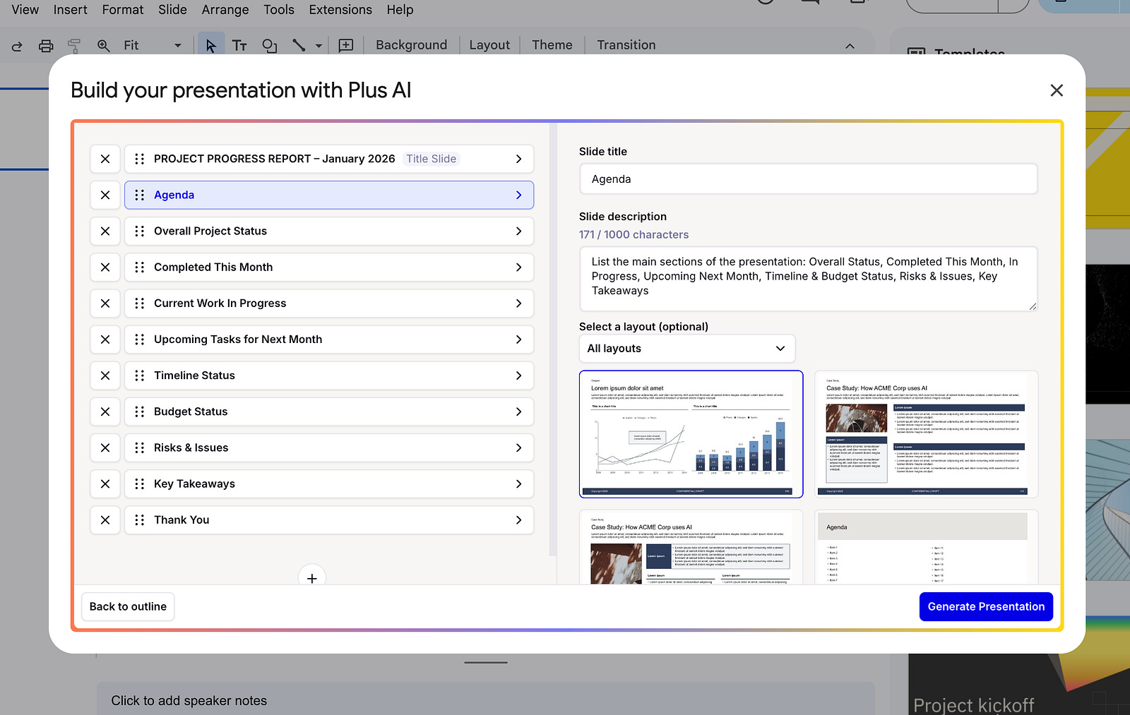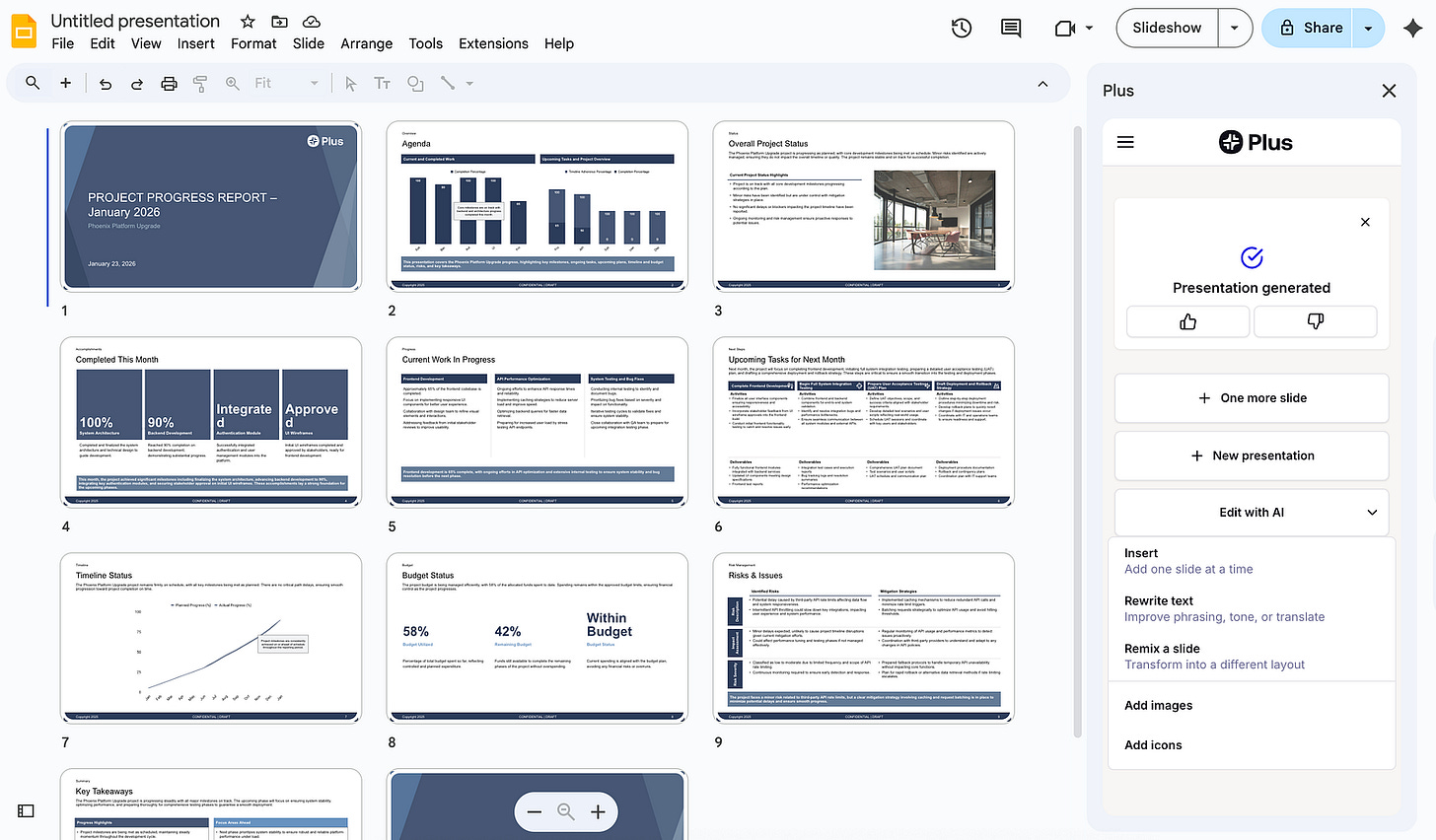The project continues to progress steadily. Focus for the next phase will be stability, performance tuning, and readiness for testing.Before it generates the slides, it gives you an outline. This is a safety check. You can look at the flow of the story and tweak the headers before the AI spends time building the visuals. Here’s the sample outline: