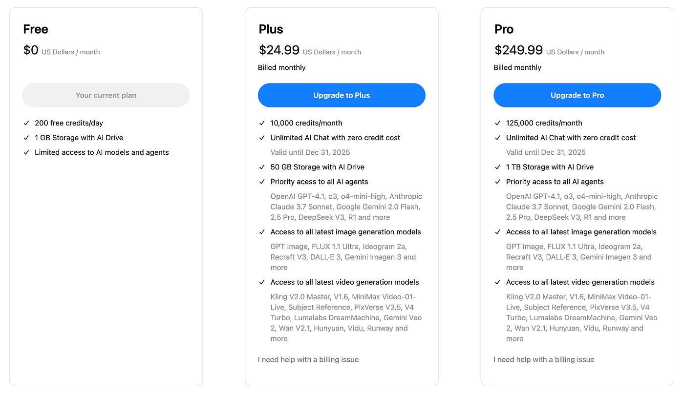 In terms of pricing, you only get 200 free credits per day and limited access to the AI models and agents. If you decide to upgrade, the paid subscription is a bit more expensive than Plus AI.
